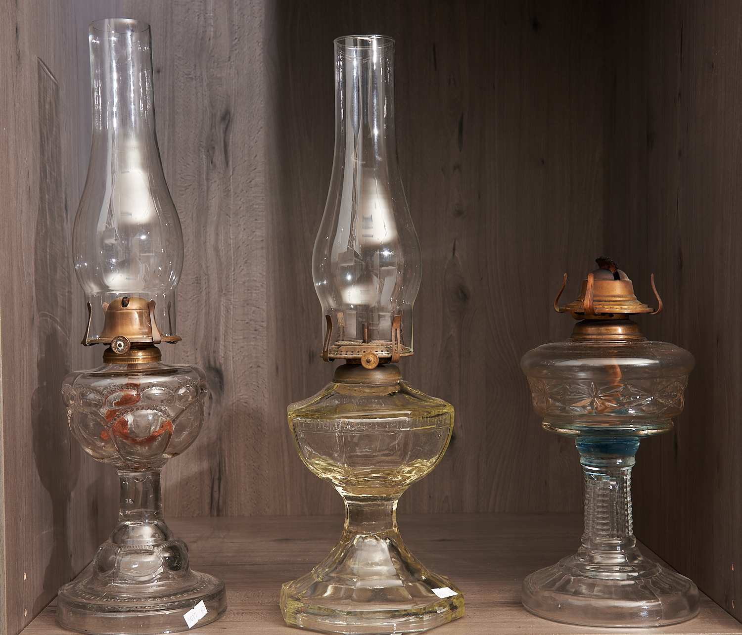 THREE EARLY 20TH CENTURY PRESSED GLASS KEROSENE LAMPS – TWO WITH ORIGINAL GLASS FLUTES H.49CM, LEONARD JOEL DELIVERY SIZE: MEDIUM