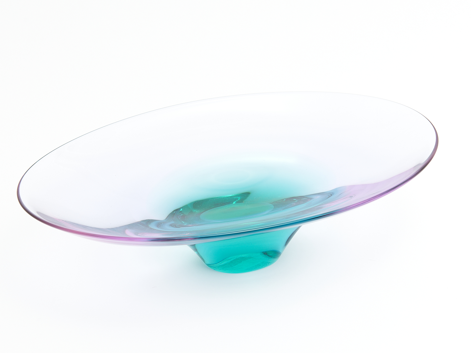 A RETRO GREEN AND PURPLE GLASS FOOTED BOWL L.34CM, LEONARD JOEL DELIVERY SIZE: SMALL