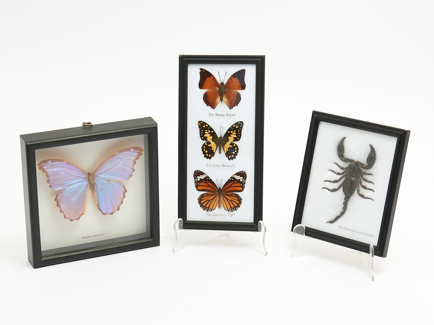 THREE CASED BUTTERFLY AND SCORPION FIGURES H.24.5CM (TALLEST), LEONARD JOEL DELIVERY SIZE: SMALL