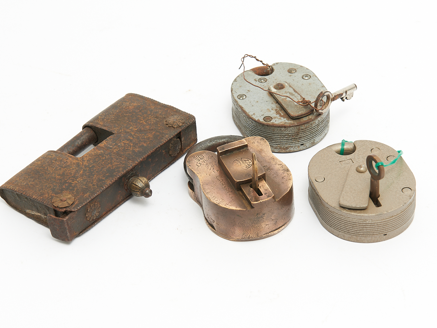 FOUR ANTIQUE PADLOCKS WITH KEYS L.14.5CM (LARGEST), LEONARD JOEL DELIVERY SIZE: SMALL