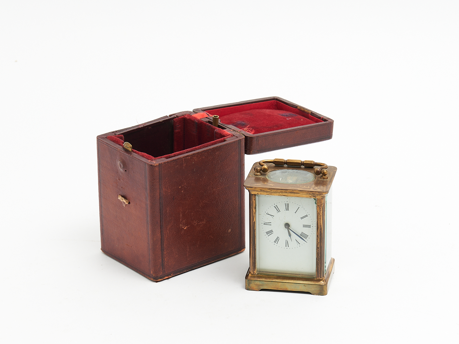 A 19TH CENTURY FRENCH BRASS CARRIAGE CLOCK WITH WHITE ENAMEL FACE IN ORIGINAL LEATHER CASE WITH KEY H.15CM (CASE), LEONARD JOEL DELIVERY SIZE: SMALL