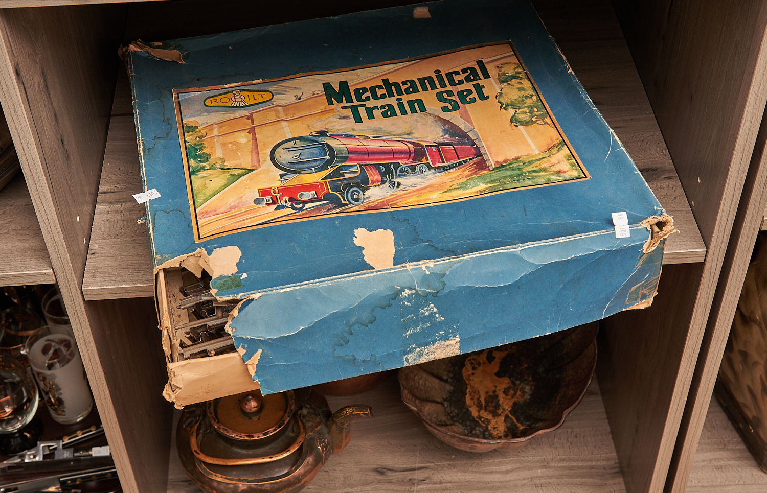 A BOXED 1940S ROBUILT MECHANICAL TRAIN SET WITH TRACK AND ACCESSORIES W.42.5CM (BOX), LEONARD JOEL DELIVERY SIZE: SMALL
