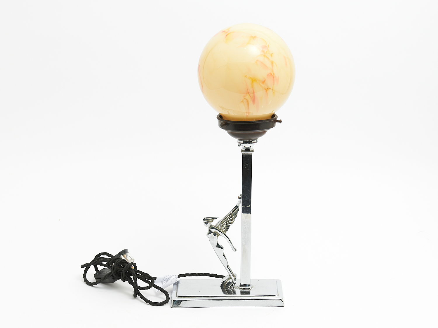 AN ART DECO CHROMED BRASS WINGED MAIDEN TABLE LAMP WITH ORIGINAL MOTTLED GLASS SHADE AND BAKELITE GALLERY H.43.5CM, LEONARD JOEL LOCAL DELIVERY: MEDIUM