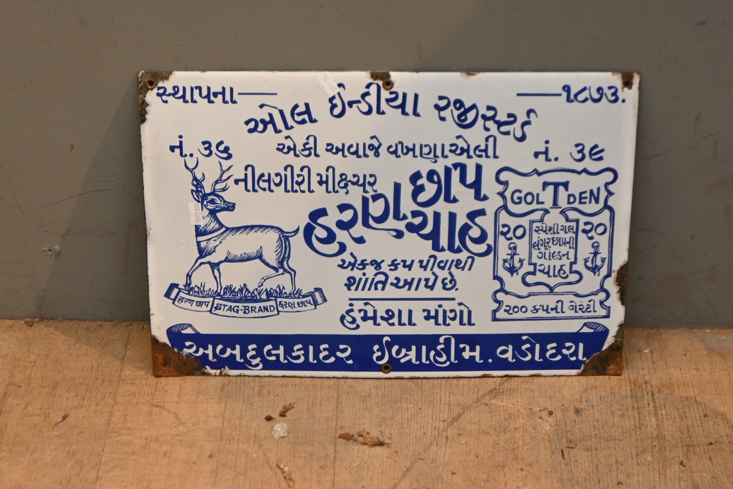 AN INDIAN BLUE AND WHITE ENAMEL ADVERTISING SIGN WITH DEER MOTIF (31H X 46 CM) (LEONARD JOEL DELIVERY SIZE: MEDIUM)