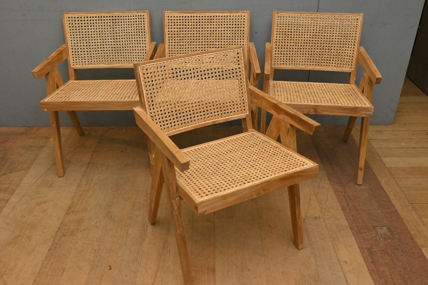FOUR TEAK AND RATTAN DINING CHAIRS (79CM H X 56CM W X 57CM D)(LEONARD JOEL DELIVERY SIZE: X- LARGE)