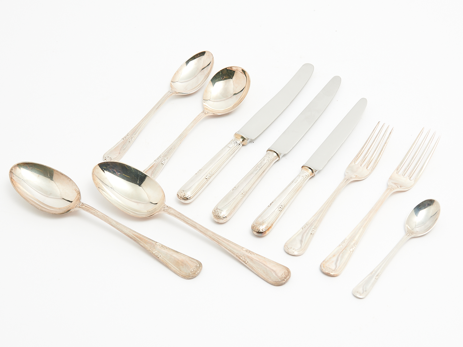 A STERLING SILVER WALKER AND HALL (SHEFFIELD) EIGHT-PIECE FLATWARE SERVICE FOR EIGHT WITH TWO SERVING SPOONS, C.1960S, 2454G (EXCLUDING KNIVES), LEONARD JOEL DELIVERY SIZE: SMALL