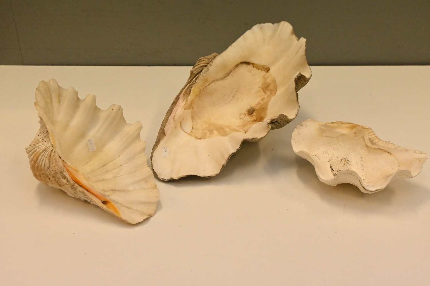 THREE CLAM SHELLS (A/F) (THE LARGEST 17H X 37W X 26D CM) (LEONARD JOEL DELIVERY SIZE: MEDIUM)