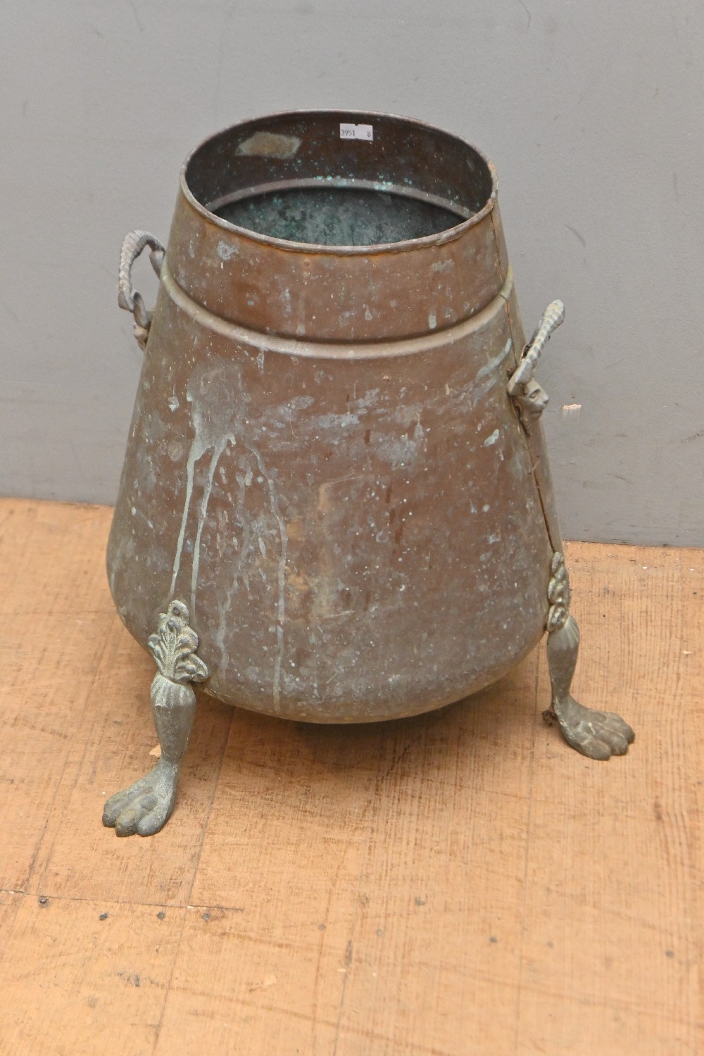 AN ANTIQUE BRASS FIRE SIDE BIN (A/F, LACKING COVER) (41CM H X 33CM DIA)(LEONARD JOEL DELIVERY SIZE: MEDIUM)