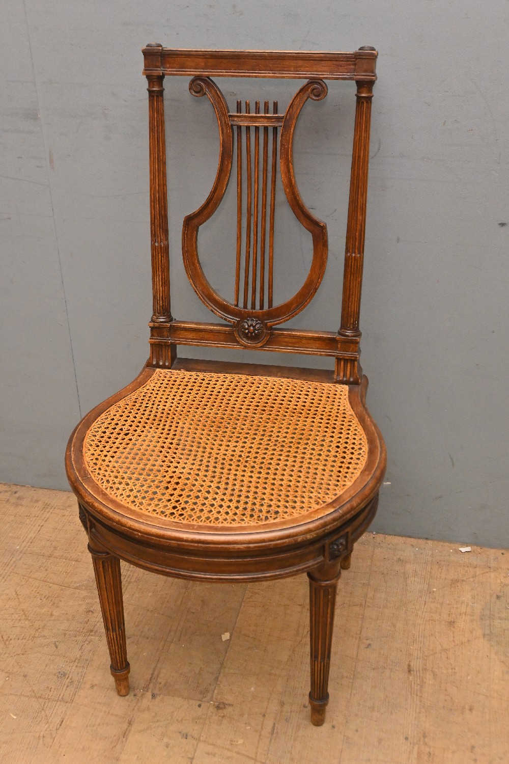 AN ANTIQUE LOUIS XVI STYLE LYRE CHAIR WITH CANE INSET SEAT (A/F) (90CM H X 45CM W X 51CM D) (LEONARD JOEL DELIVERY SIZE: LARGE)
