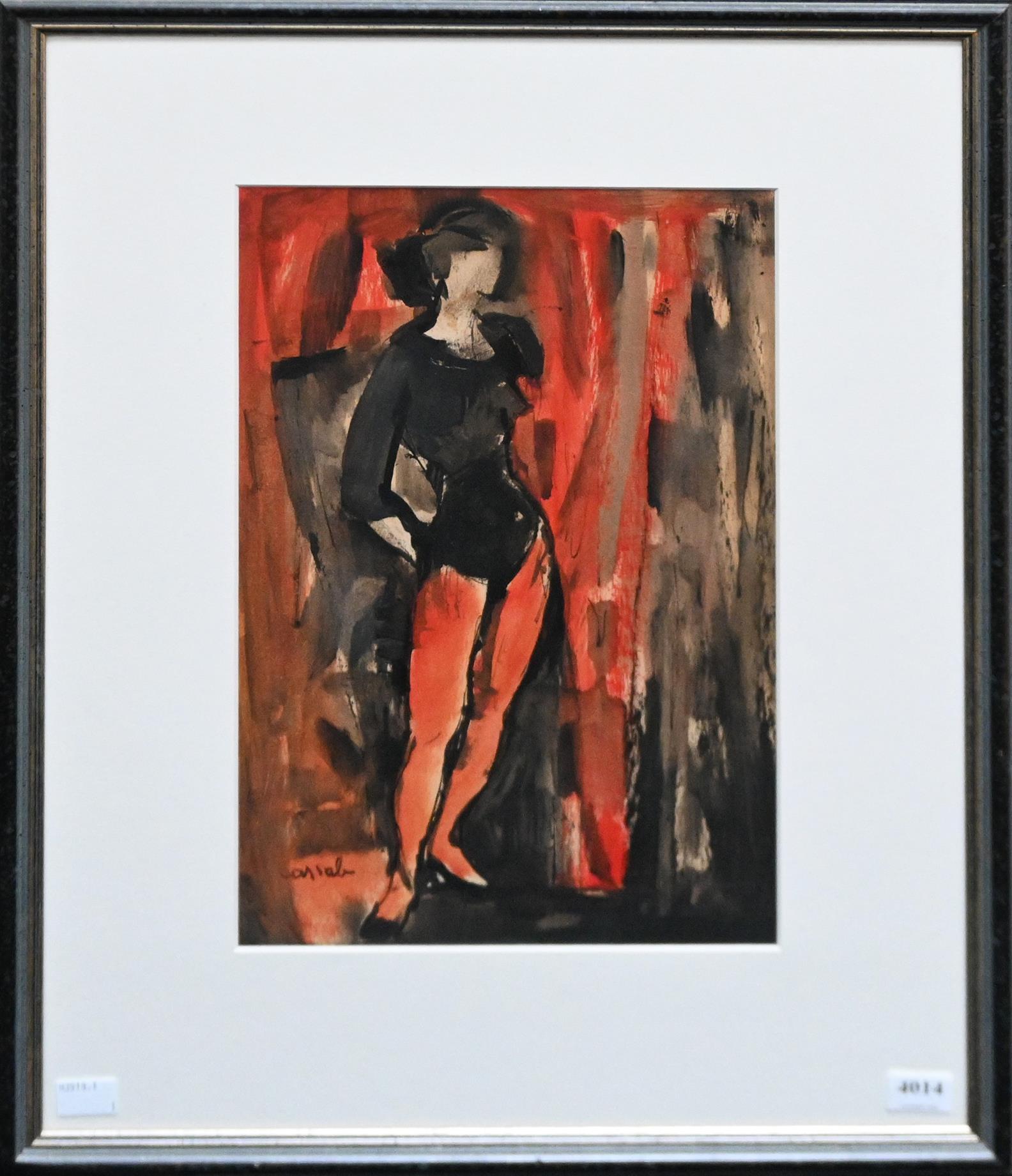 JUDY CASSAB, FIGURE, INK AND WATERCOLOUR, SIGNED LOWER LEFT, 35.5 X 21.5CM, FRAME SIZE: 56 X 41CM