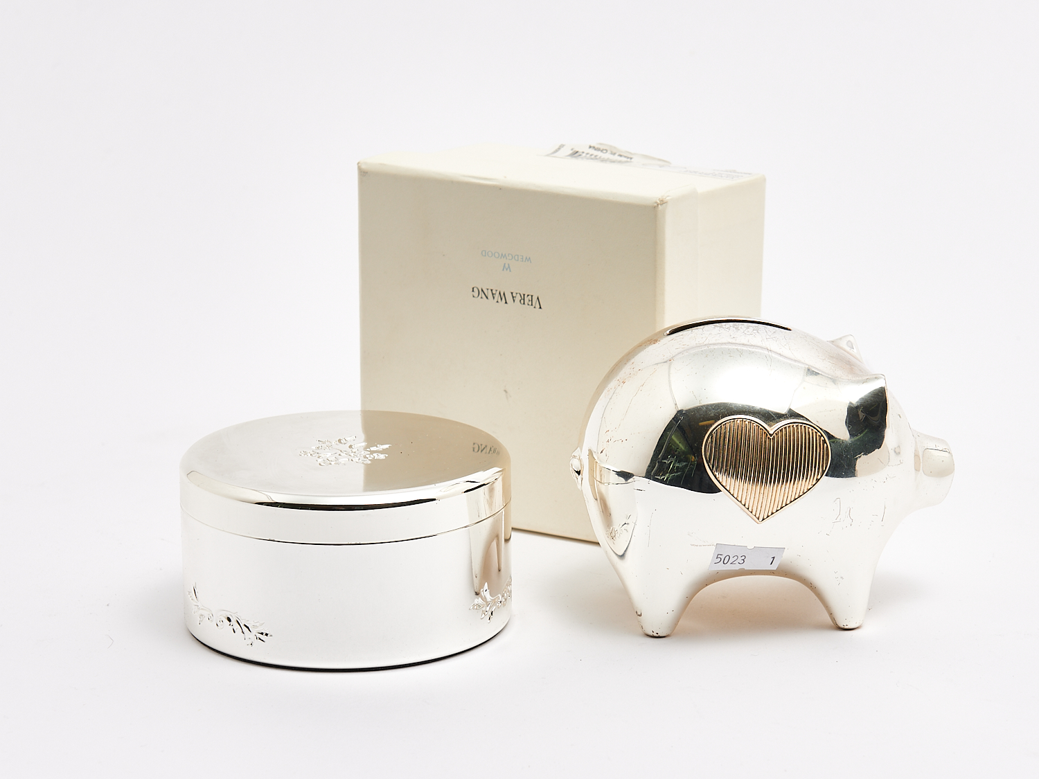 A SILVER PLATED WEDGWOOD PIGGY BANK AND LIDDED/LINED TRINKET DISH WITH BOX L.11.5CM (BANK), LEONARD JOEL DELIVERY SIZE: SMALL
