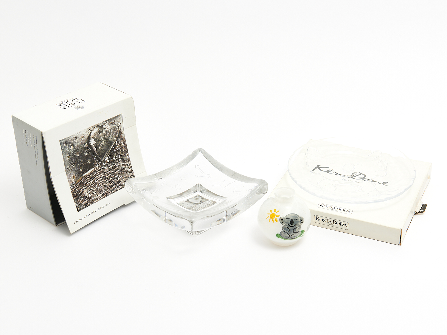 A KOSTA BODA ART GLASS LOT WITH RARE HAND PAINTED KEN DONE KOALA BUD VASE, KEN DONE KOALA PLATTER WITH BOX AND BERTIL VALLIEN 'SILVER HEART' TRAY WITH BOX DIA.19CM (PLATTER), LEONARD JOEL DELIVERY SIZE: SMALL