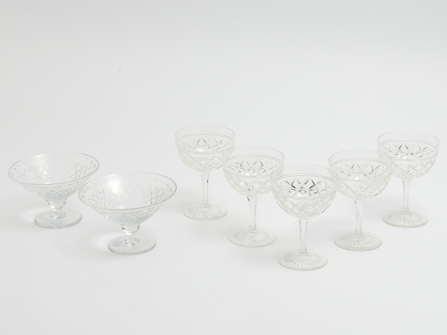 A SET OF FIVE ART DECO STUART CRYSTAL CHAMPAGNE COUPES WITH A PAIR OF WEBB CORBETT CRYSTAL SAUCERS H.11.5CM (COUPES), LEONARD JOEL DELIVERY SIZE: MEDIUM