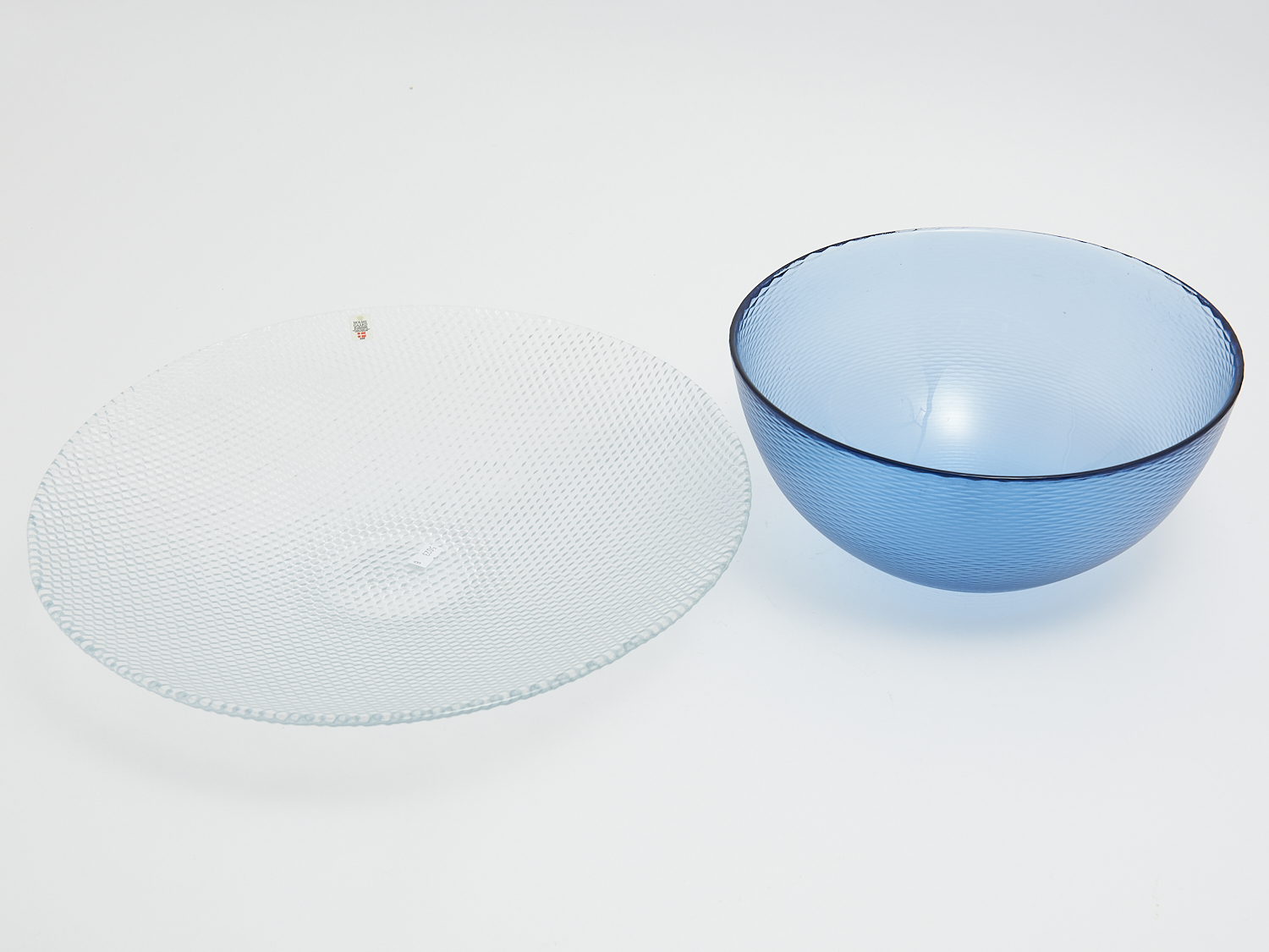 A LARGE 'TRIGONA' PLATTER BY TORBEN JORGENSEN WITH A LARGE 'FACET' BOWL BY ANJA KJAER, BOTH FOR HOLMEGAARD DENMARK DIA.40CM (PLATTER), LEONARD JOEL DELIVERY SIZE: MEDIUM