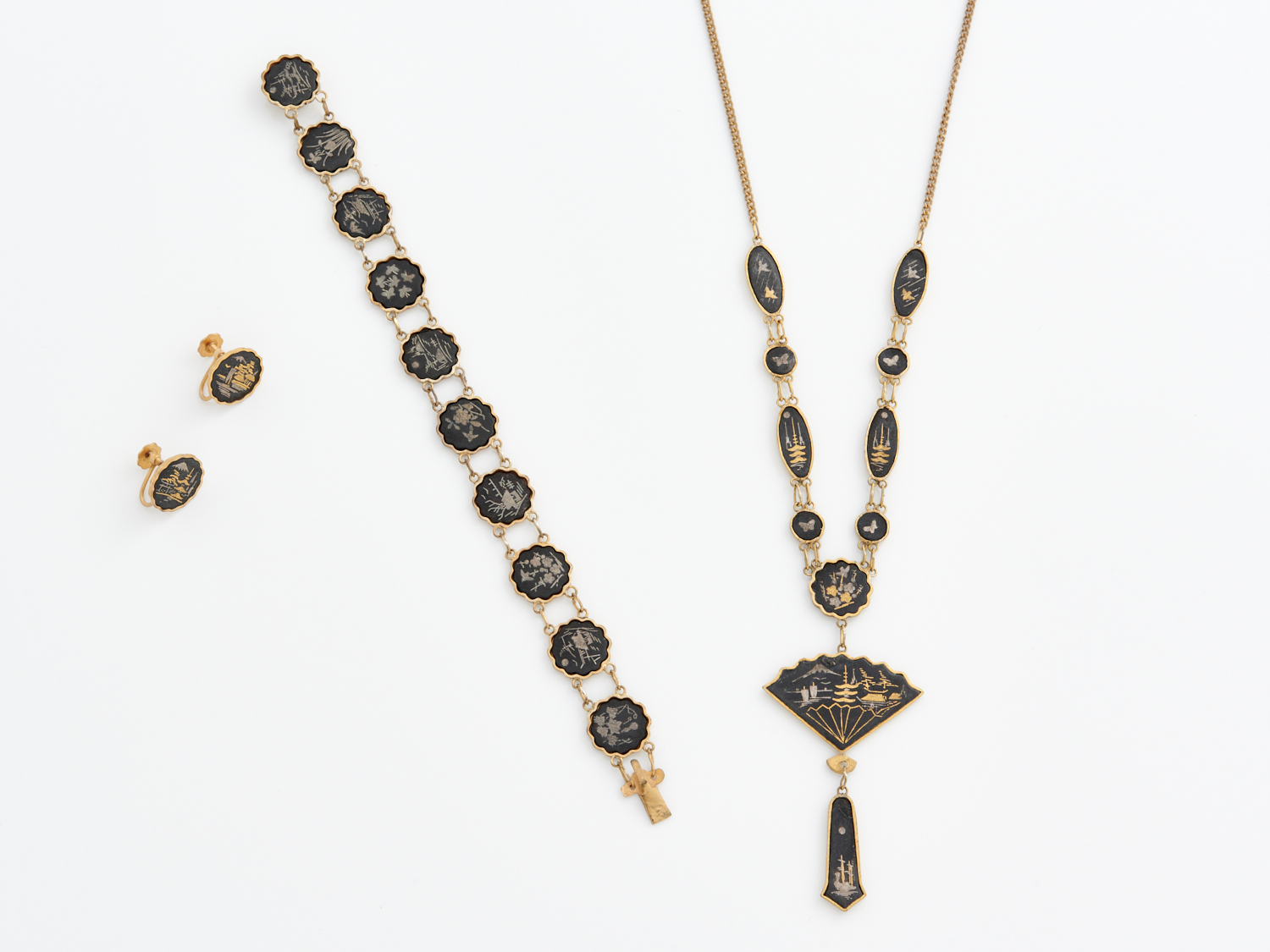 A DAMASCENE JEWELLERY SUITE IN GOLD PLATE, COMPRISING A NECKLACE, A BRACELET AND EARRINGS TO SCREW BACK FITTINGS
