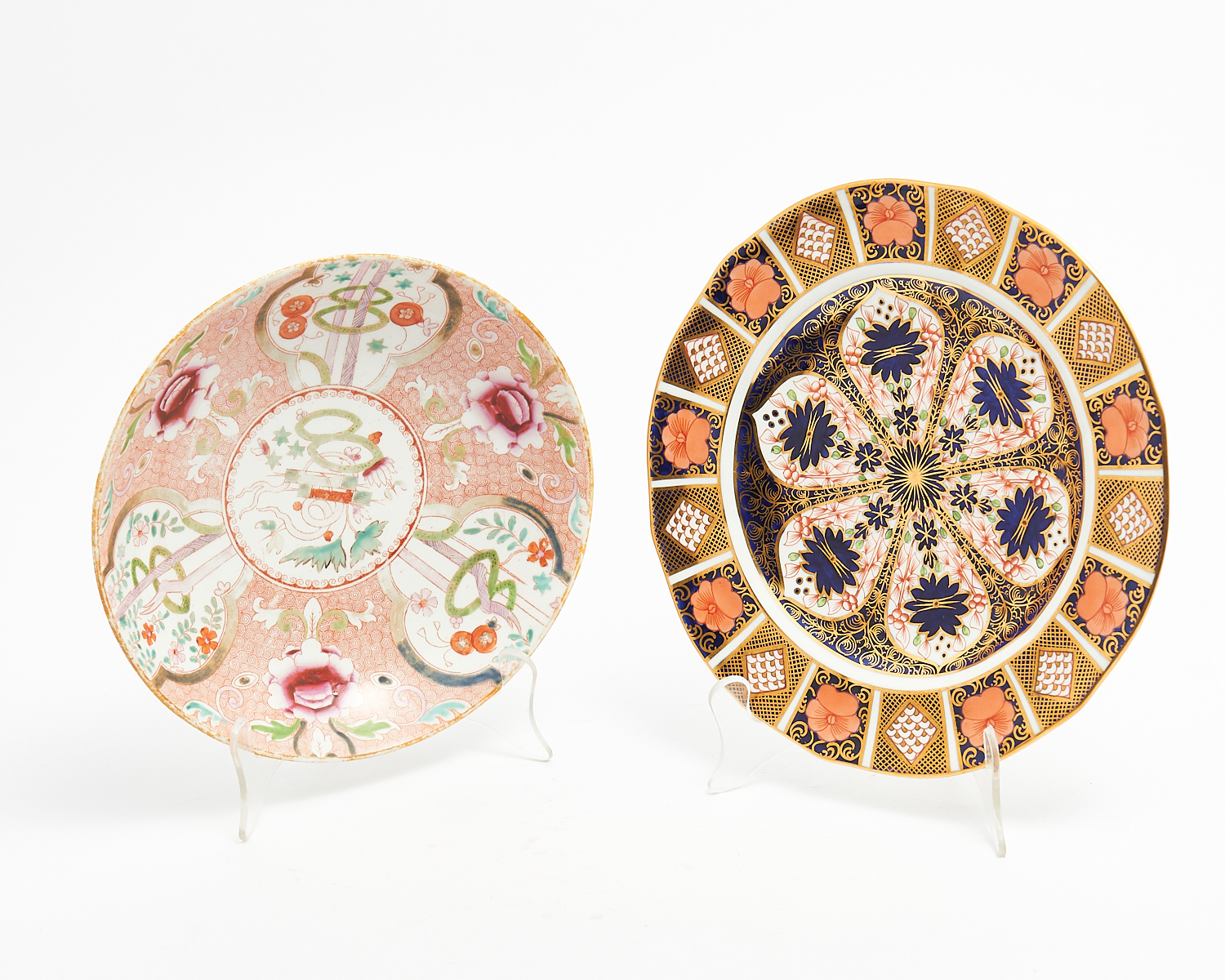 A 19th CENTURY ENGLISH DISH IN CHINESE STYLE AND A CROWN DERBY 'OLD IMARI' PLATE DIA.23CM, LEONARD JOEL DELIVERY SIZE: SMALL