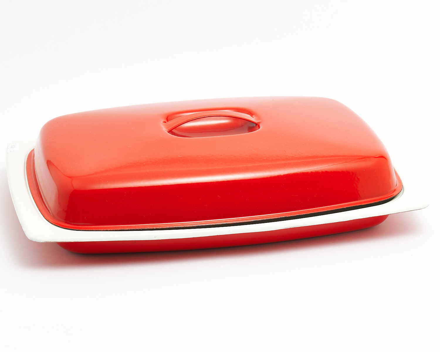A 1960S FINNISH ENAMEL BAKING DISH WITH LID BY KAJ FRANCK FOR FINEL/ARABIA L.45CM, LEONARD JOEL DELIVERY SIZE: SMALL