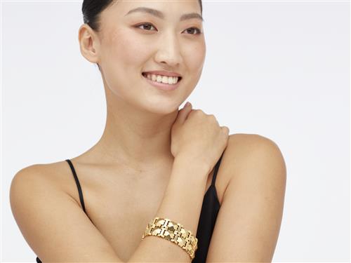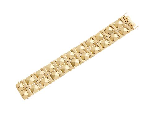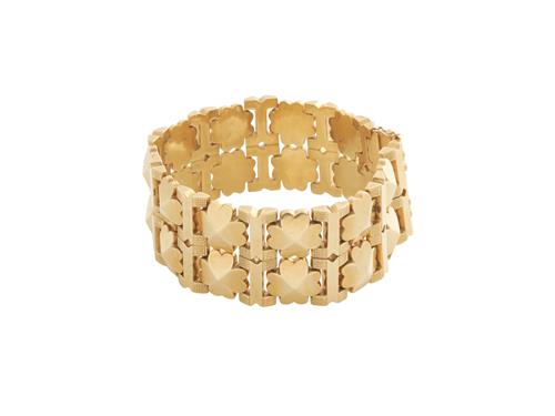 The wide strap composed of four leaf clover and geometric shaped links, completed by a tongue and groove clasp, length approximately 205mm, gross weight approximately 65.5 grams.