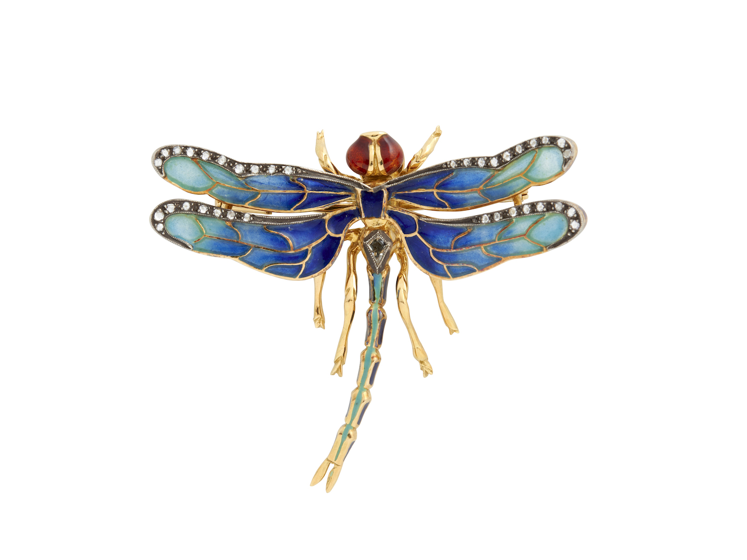 Modelled as a dragonfly, the wings, head and tail detailed with enamel, the body set with a kite-cut diamond, the wings detailed with single-cut diamonds, measuring approximately 50mm x 57mm.
