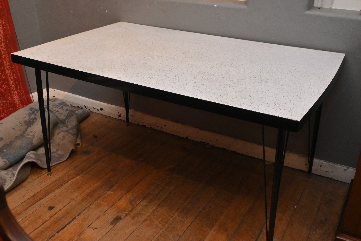 A 1950s STYLE KITCHEN TABLE WITH LAMINATED PLASTIC TOP (76H X 148W X 92D CM) (PLEASE NOTE THIS HEAVY ITEM MUST BE REMOVED BY CARRIERS AT THE CUSTOMER'S EXPENSE. LEONARD JOEL STAFF CANNOT ASSIST CARRYING THIS ITEM) (X-LARGE ITEM)