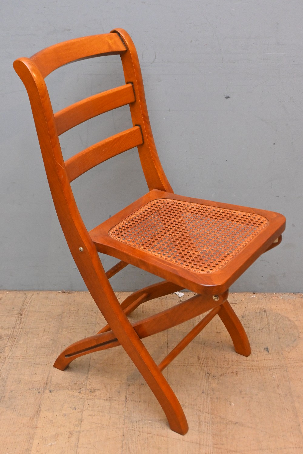 A BEECH FOLDING CHAIR, WITH CANED SEAT (86H X 39W X 53D CM) (LEONARD JOEL DELIVERY SIZE: LARGE)