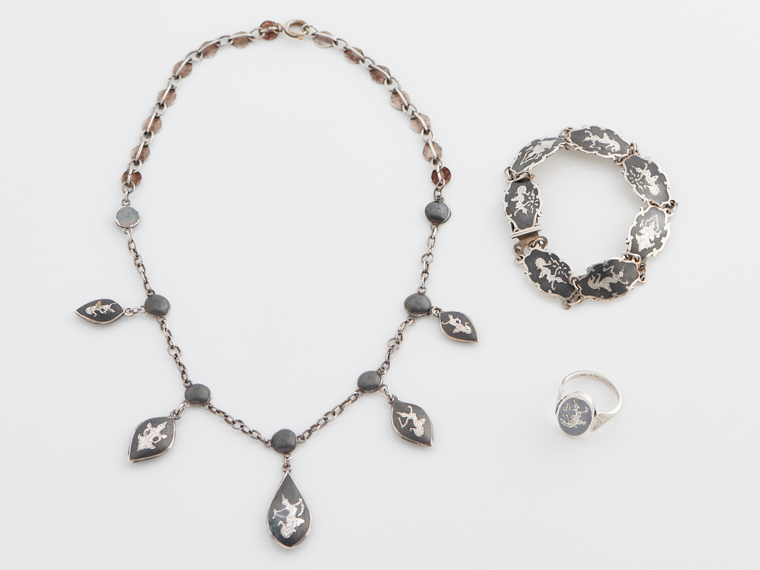 A SIAM JEWELLERY SUITE IN STERLING SILVER, COMPRISING A NECKLACE, BRACELET AND SPINNER RING, SIZE M