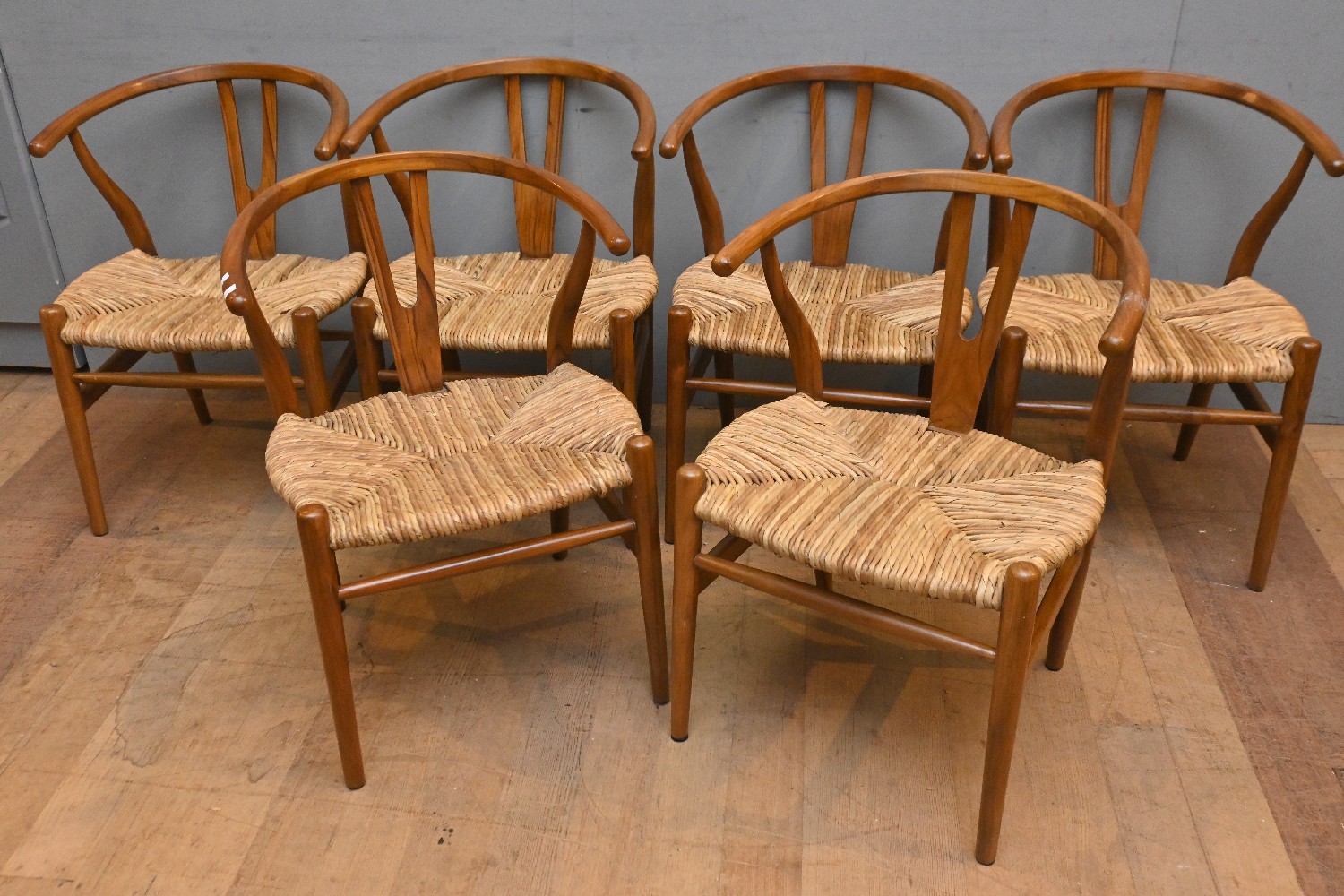 A SET OF SIX WISHBONE CHAIRS WITH RUSH SEATS (74H X 55W X 55D CM) (LEONARD JOEL DELIVERY SIZE: X-LARGE)