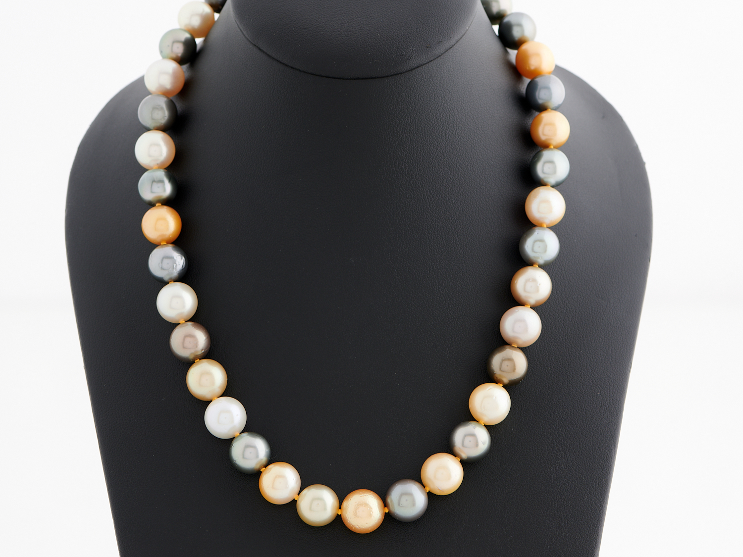 A STRAND OF SOUTH SEA AND TAHITIAN PEARLS, TO A CLASP IN 18CT GOLD, THE PEARLS MEASURING BETWEEN 11 AND 12 MM, LENGTH 460MM