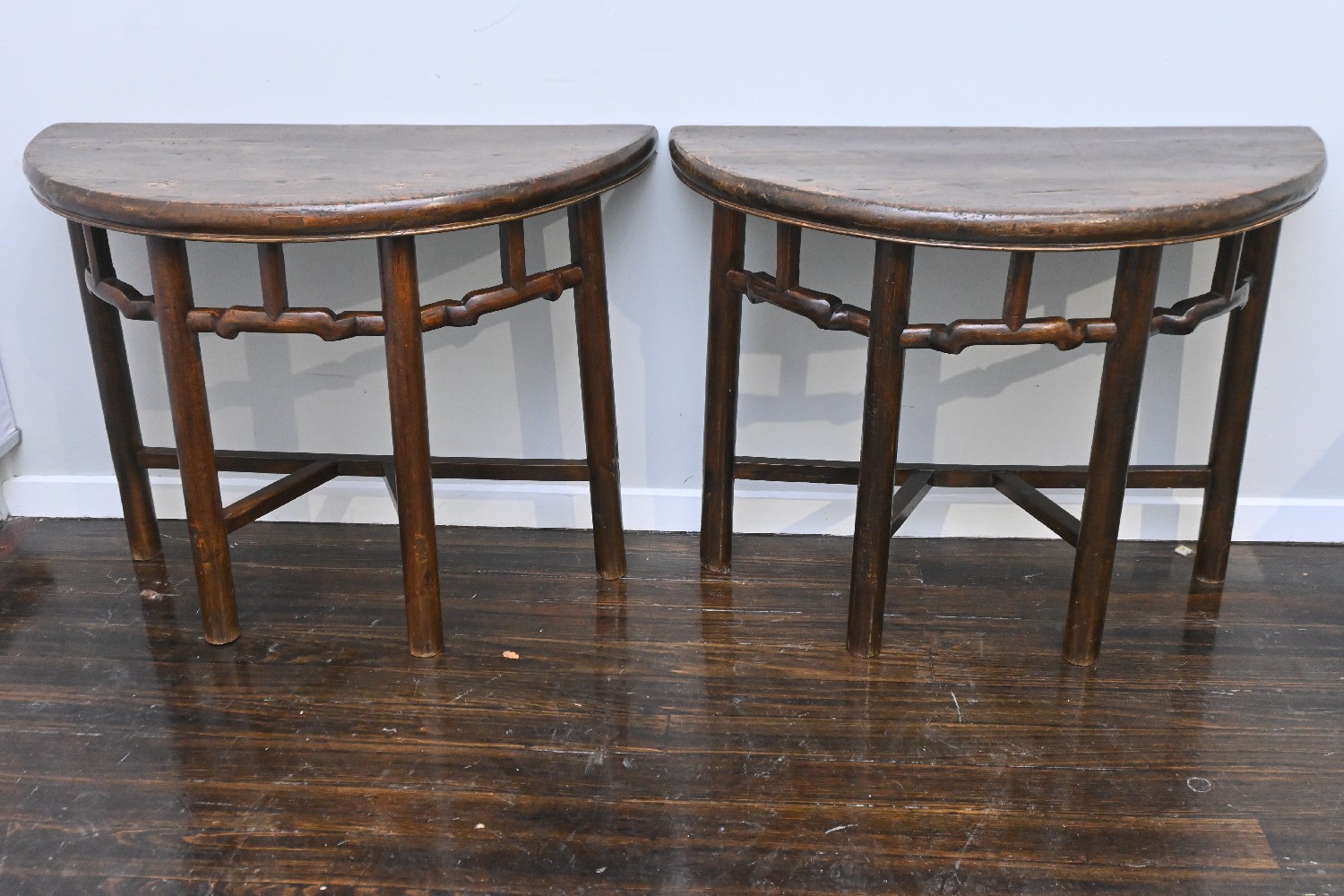 A PAIR OF 19th CHINESE STAINED WALNUT HALF-ROUND SIDE TABLES (83H X 113W X 56D CM) (PLEASE NOTE THIS HEAVY ITEM MUST BE REMOVED BY CARRIERS AT THE CUSTOMER'S EXPENSE. LEONARD JOEL STAFF CANNOT ASSIST CARRYING THIS ITEM) (X-LARGE ITEM)