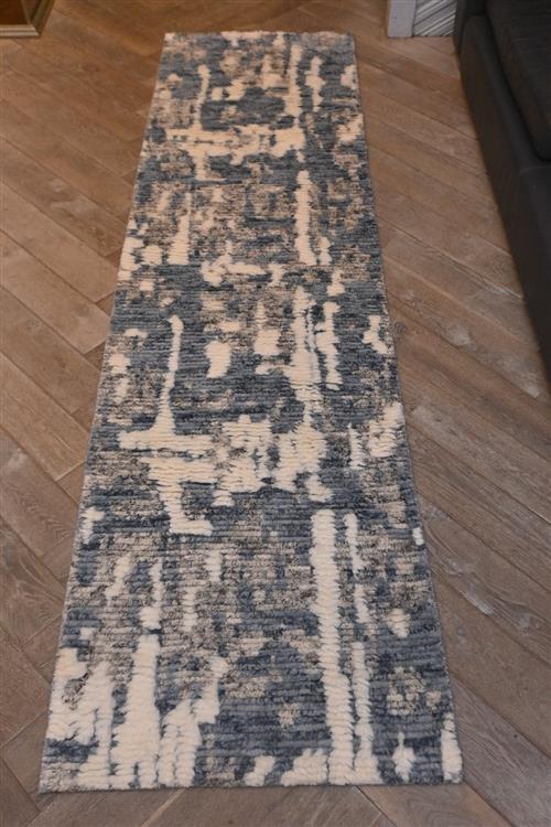 A BRAND-NEW MOROCCAN BERBER RUNNER. 100% WOOL PLUSH PILE, HAND KNOTTED IN CREAM, BLUE AND GREY TONES. SIZE: 300 X 82 CM. ORIGIN: INDIA - RRP: $900