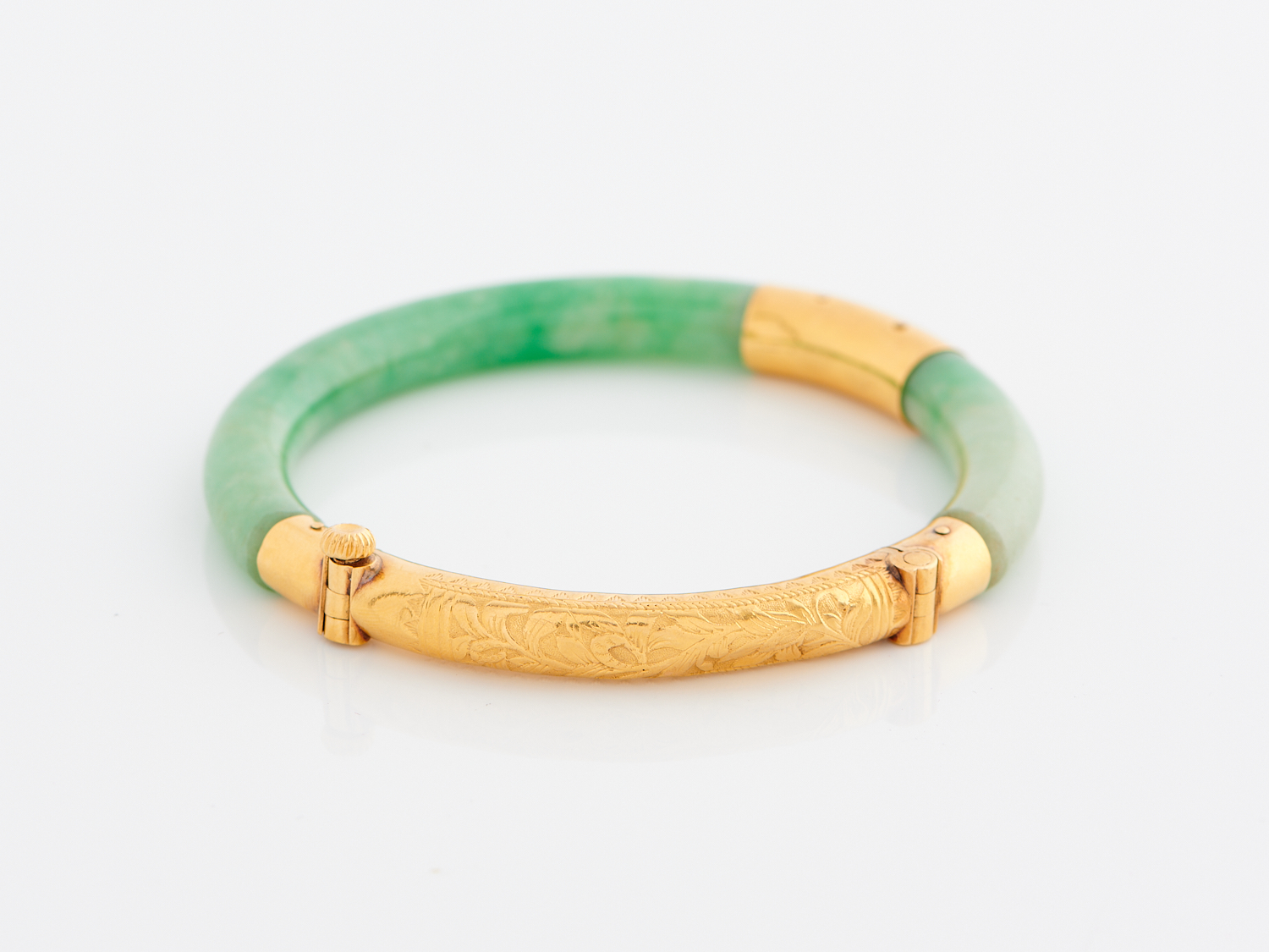 A JADEITE BANGLE IN 22CT GOLD, HALLMARKED, INNER DIAMETER 55MM