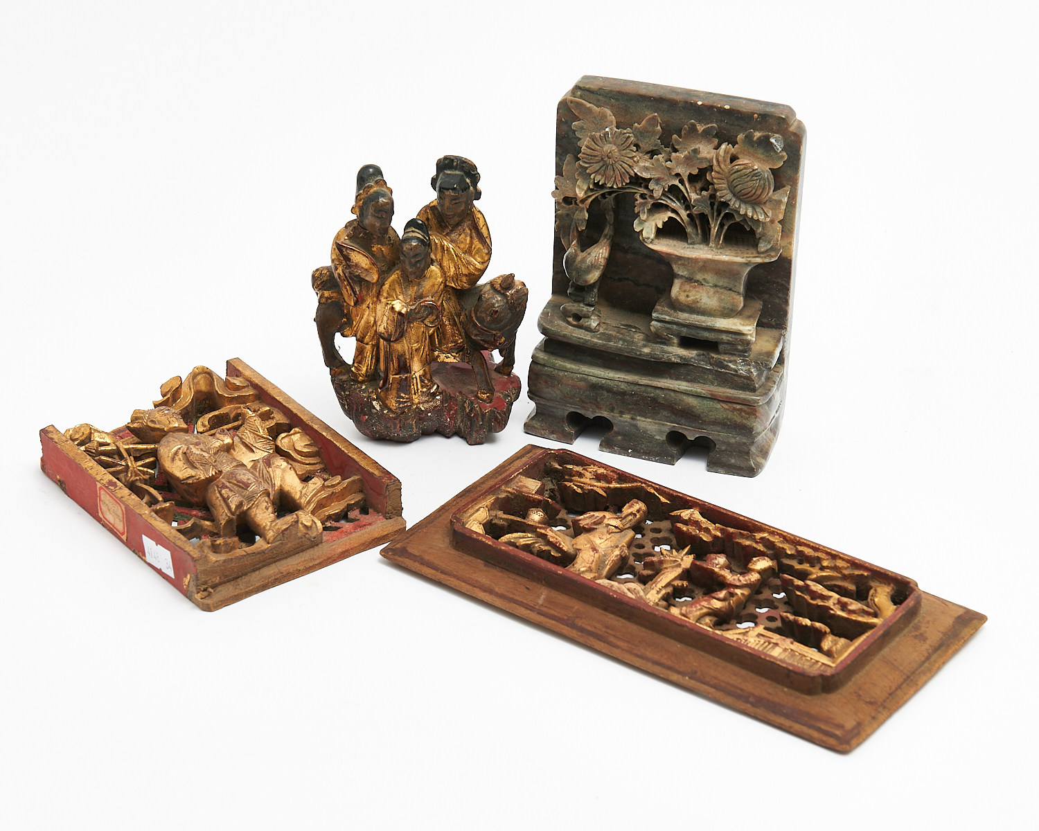 A GROUP OF THREE CHINESE CARVED AND GILT WOOD DECORATIVE OBJECTS, AND ANOTHER IN CARVED SOAPSTONE H.16CM (TALLEST), LEONARD JOEL DELIVERY SIZE: SMALL