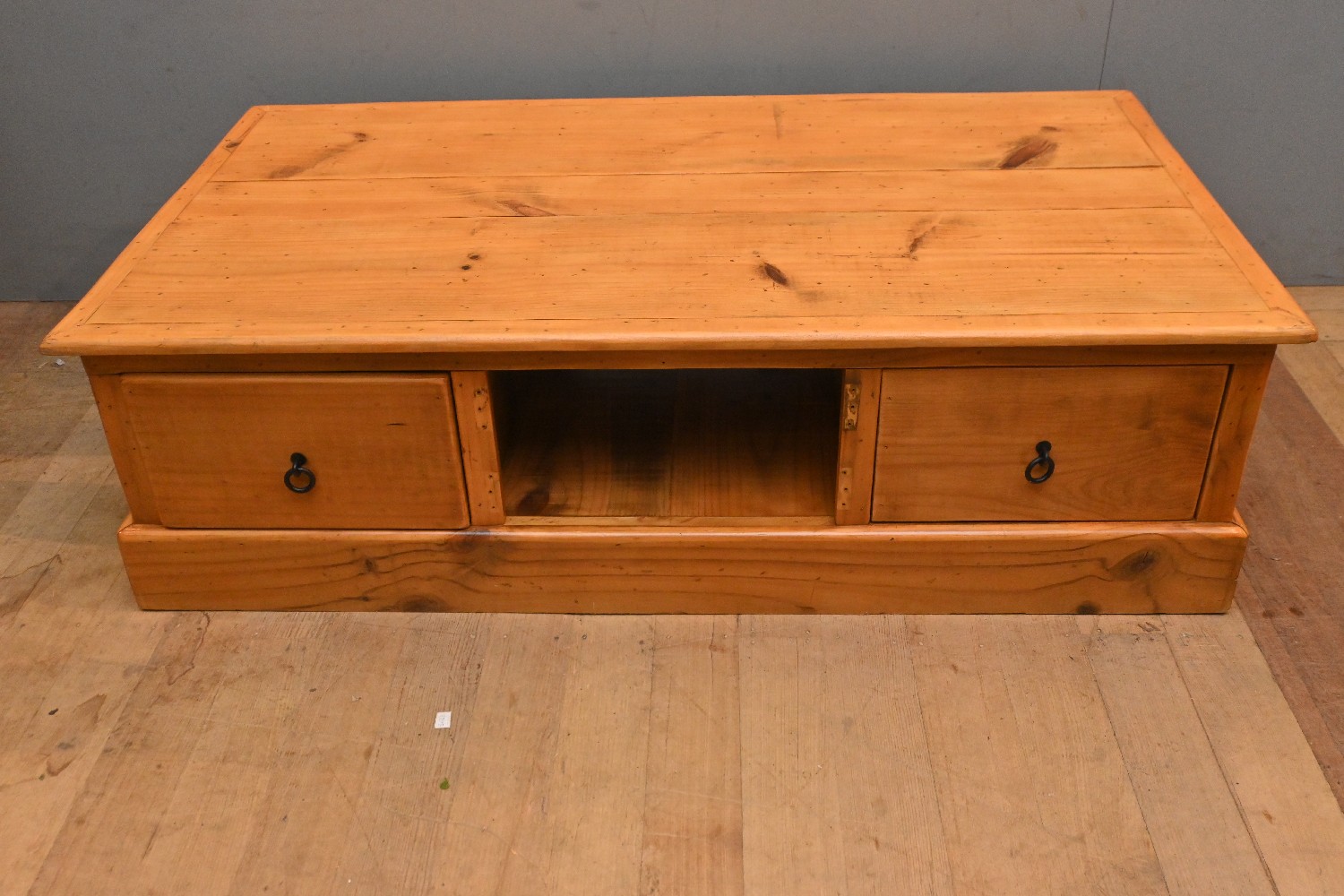 A PINE TWO DRAWER COFFEE TABLE (A/F) (42H X 145W X 80D CM) (PLEASE NOTE THIS HEAVY ITEM MUST BE REMOVED BY CARRIERS AT THE CUSTOMER'S EXPENSE. LEONARD JOEL STAFF CANNOT ASSIST CARRYING THIS ITEM) (X-LARGE ITEM)