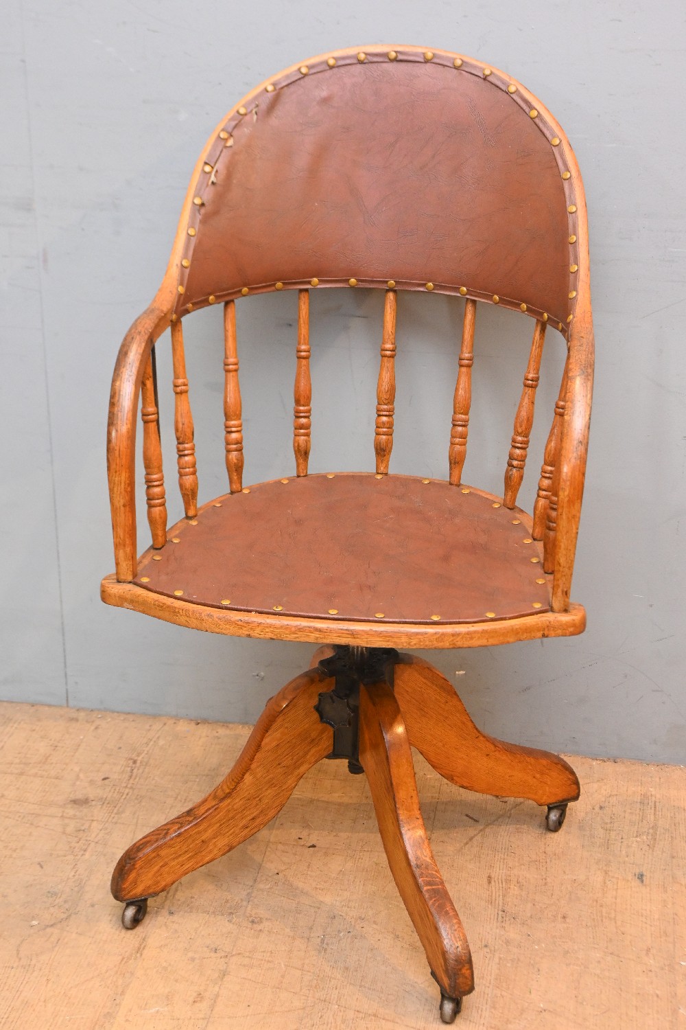 A LATE 19th CENTURY OAK SWIVELLING DESK CHAIR (A/F) (100H X 52W X 60D CM) (LEONARD JOEL DELIVERY SIZE: X-LARGE)