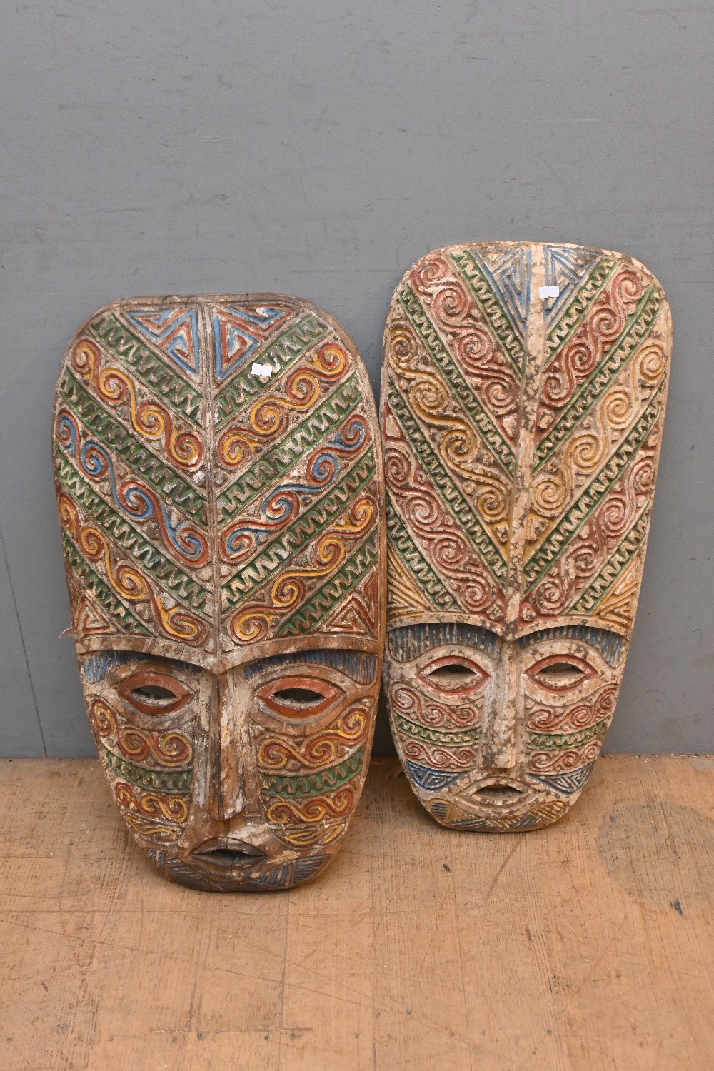 A PAIR OF LARGE CARVED WOOD TRIBAL MASKS (82H X 41W CM) (LEONARD JOEL DELIVERY SIZE: LARGE)