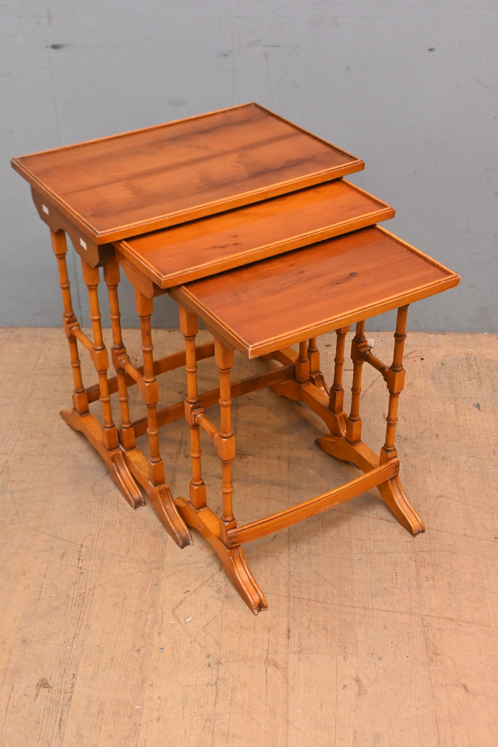A NEST OF THREE HARDWOOD OCCASIONAL TABLES, THE TOPS VENEERED IN YEW (A/F) (56H X 50W X 35D CM) (LEONARD JOEL DELIVERY SIZE: LARGE)