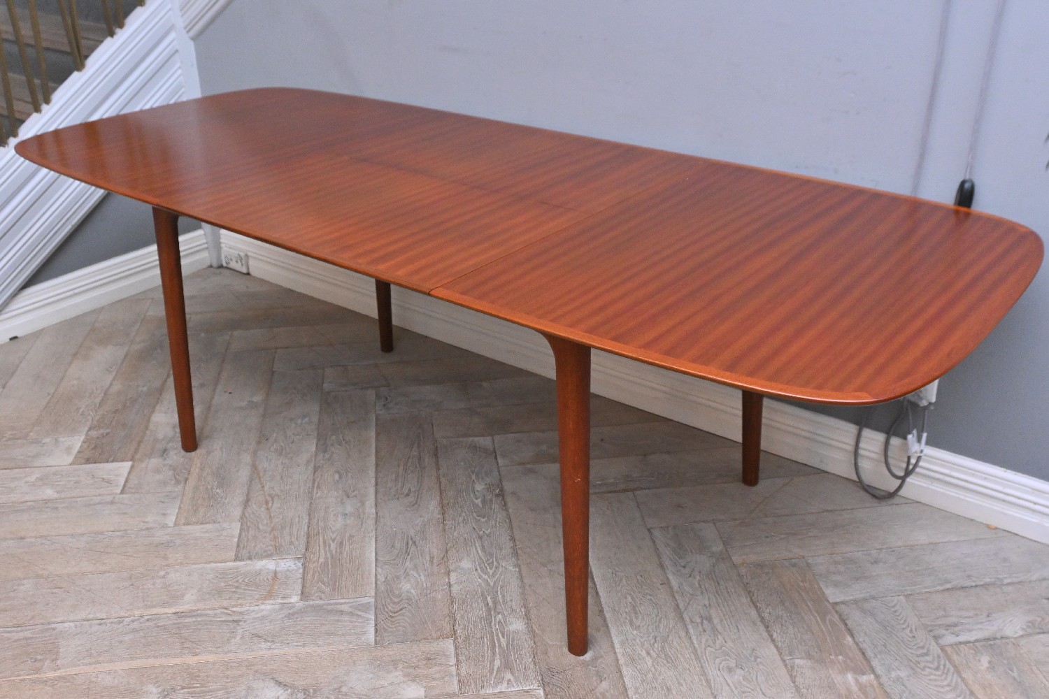 A LARGE WALNUT NOBLETT EXTENSION DINING TABLE (73H X 229 EXTENDED W X 94D CM) (PLEASE NOTE THIS HEAVY ITEM MUST BE REMOVED BY CARRIERS AT THE CUSTOMER'S EXPENSE. LEONARD JOEL STAFF CANNOT ASSIST CARRYING THIS ITEM) (X-LARGE ITEM)