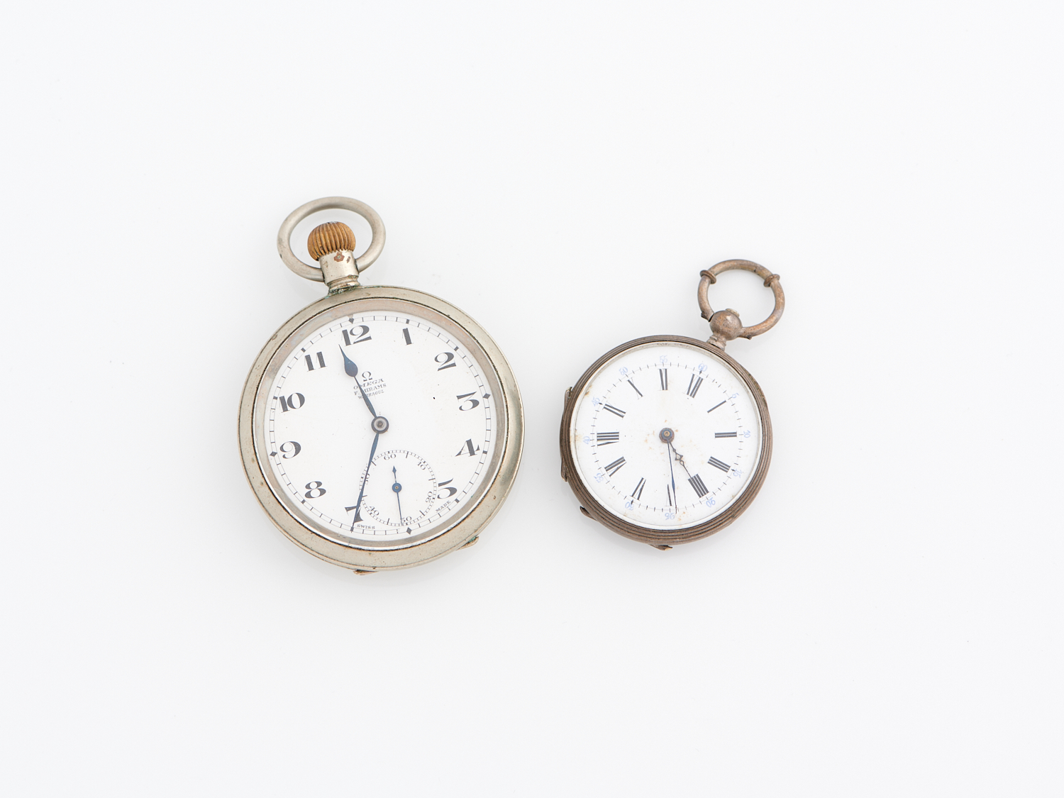 TWO VINTAGE POCKET WATCHES, INCLUDING AN OMEGA IN SILVER TONE METAL AND ONE IN CONTINENTAL SILVER