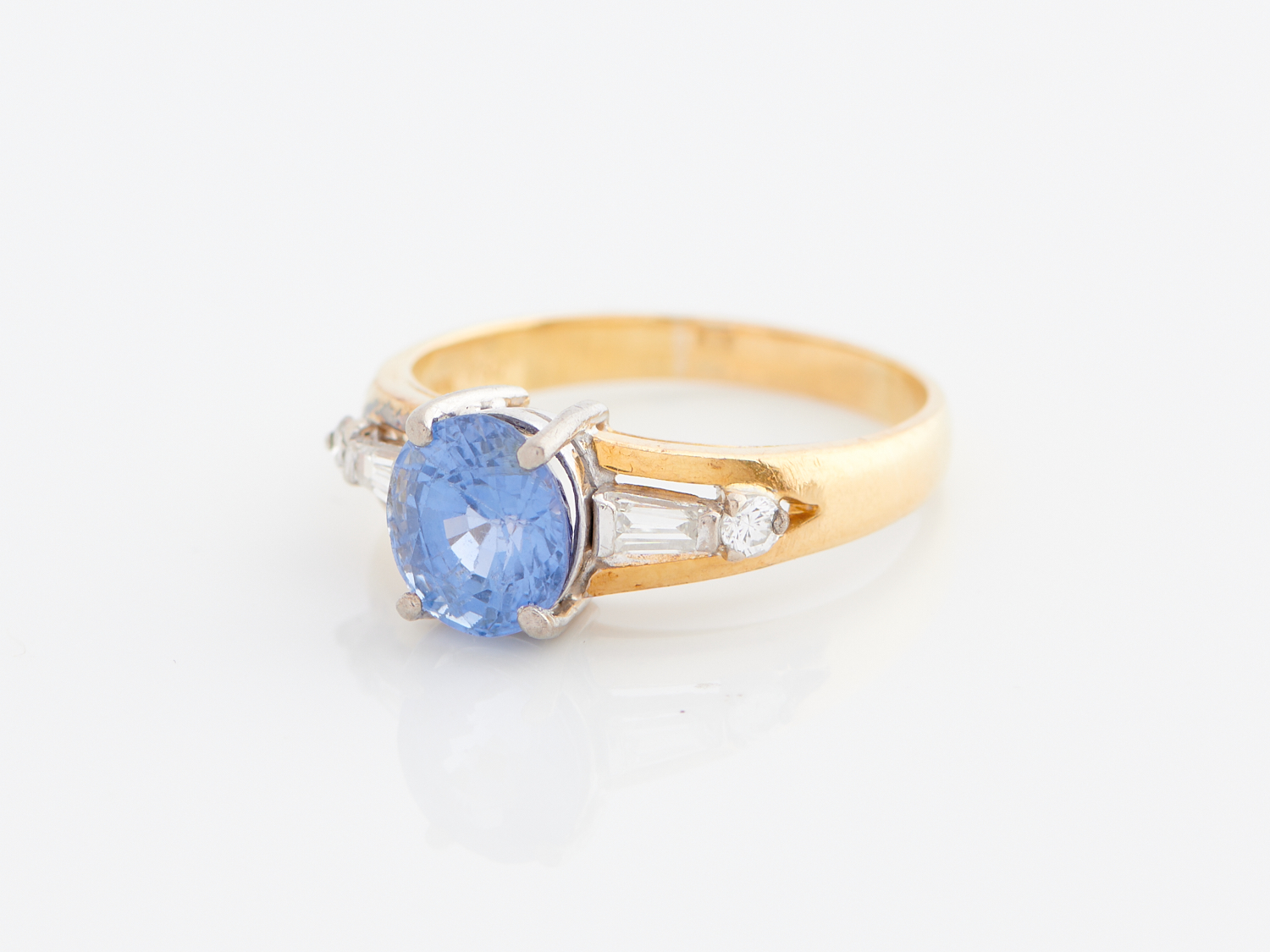 A SAPPHIRE AND DIAMOND RING IN 18CT GOLD, THE OVAL SAPPHIRE WEIGHING 2.15CTS, SIZE N 1/2 , 4.35GMS