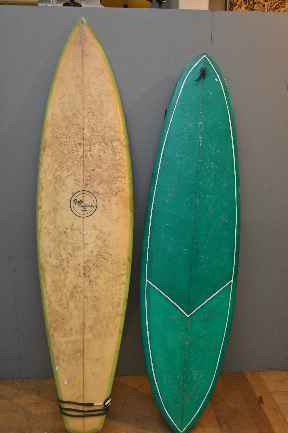 TWO OLD SURFBOARDS, INCLUDING GAZELLE AND GREEN BODIED (204H X 50W CM) (LEONARD JOEL DELIVERY SIZE: X-LARGE)