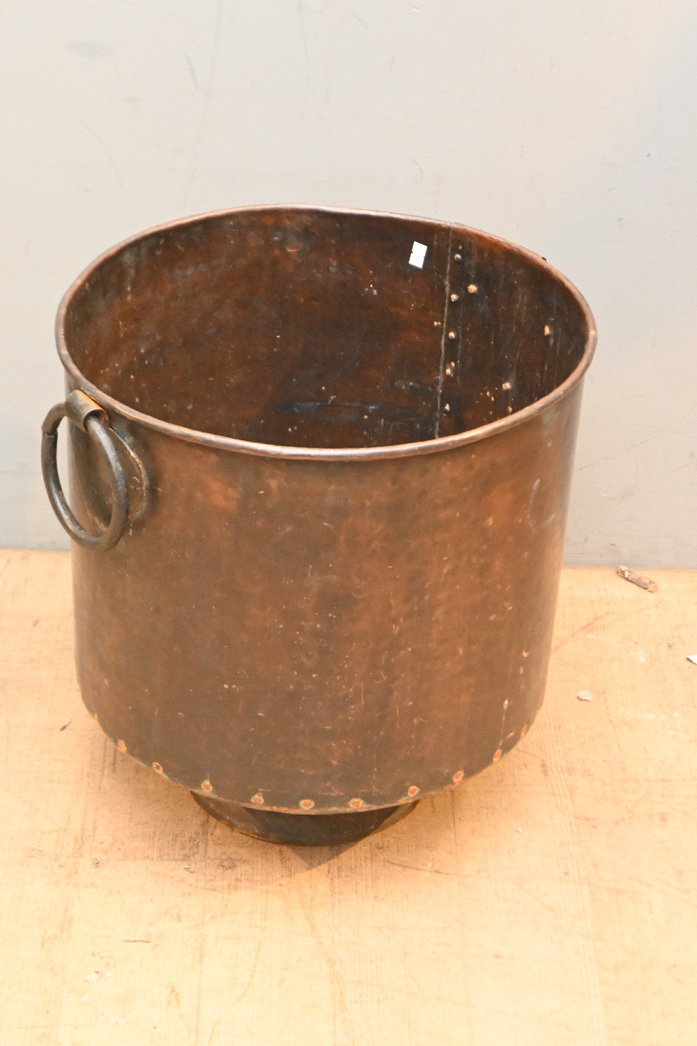 A LARGE EARLY 20TH CENTURY FRENCH SOLID COPPER CIRCULAR SWING HANDLE FIRE WOOD BUCKET (46H X 46D CM) (LEONARD JOEL DELIVERY SIZE: LARGE)