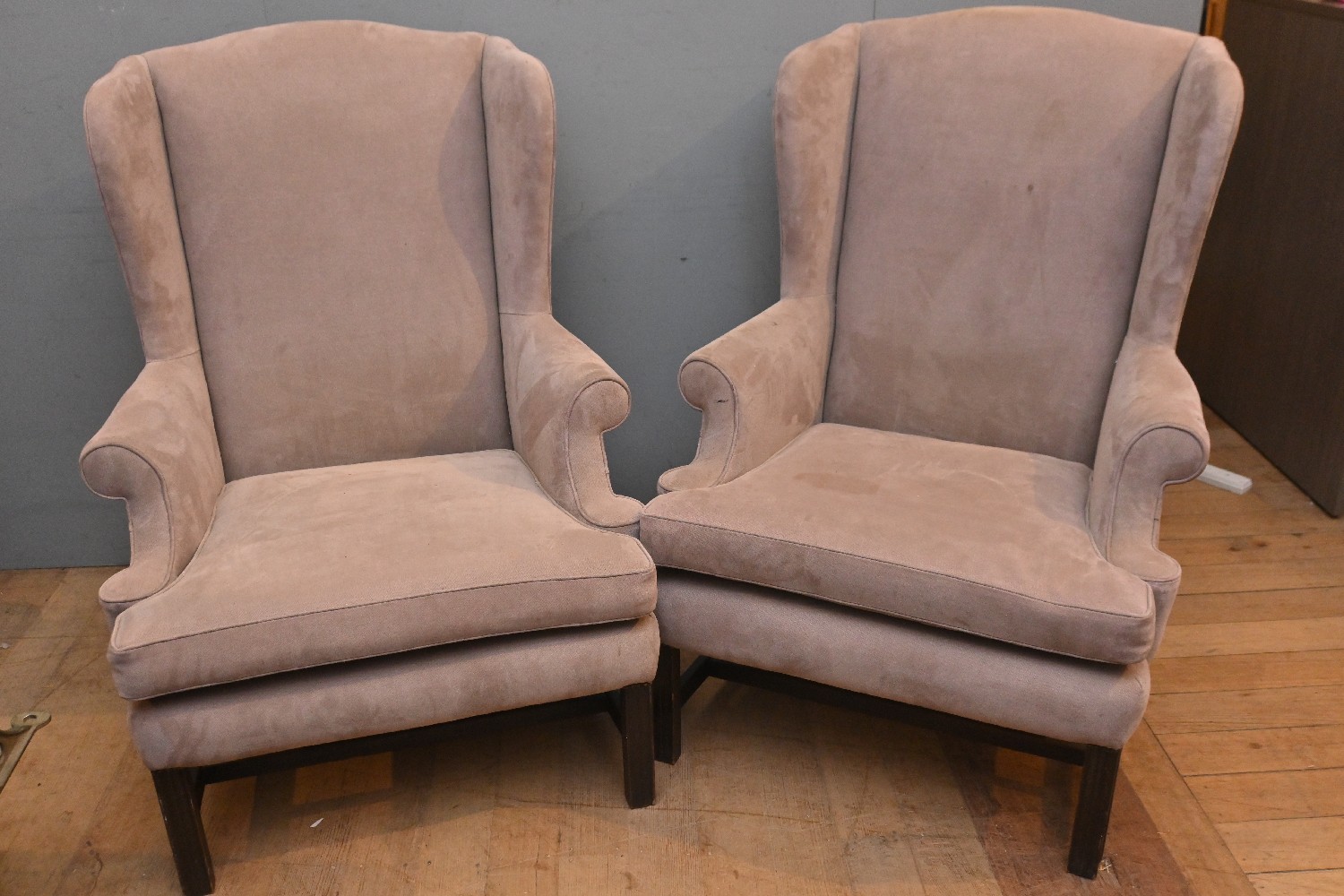 A PAIR OF AMERICAN MAITLAND SMITH UPHOLSTERED WINGBACKS (A/F) (112H X 82W X 90D CM) (PLEASE NOTE THIS HEAVY ITEM MUST BE REMOVED BY CARRIERS AT THE CUSTOMER'S EXPENSE. LEONARD JOEL STAFF CANNOT ASSIST CARRYING THIS ITEM) (X-LARGE ITEM)