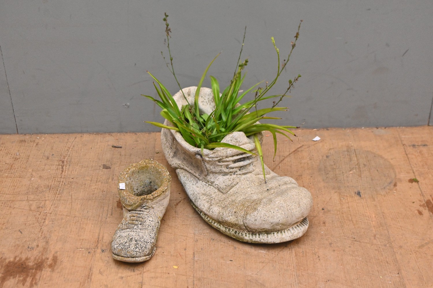 TWO CONCRETE BOOTS (A/F) (LARGEST 45W CM) (PLEASE NOTE THIS HEAVY ITEM MUST BE REMOVED BY CARRIERS AT THE CUSTOMER'S EXPENSE. LEONARD JOEL STAFF CANNOT ASSIST CARRYING THIS ITEM) (X-LARGE ITEM)