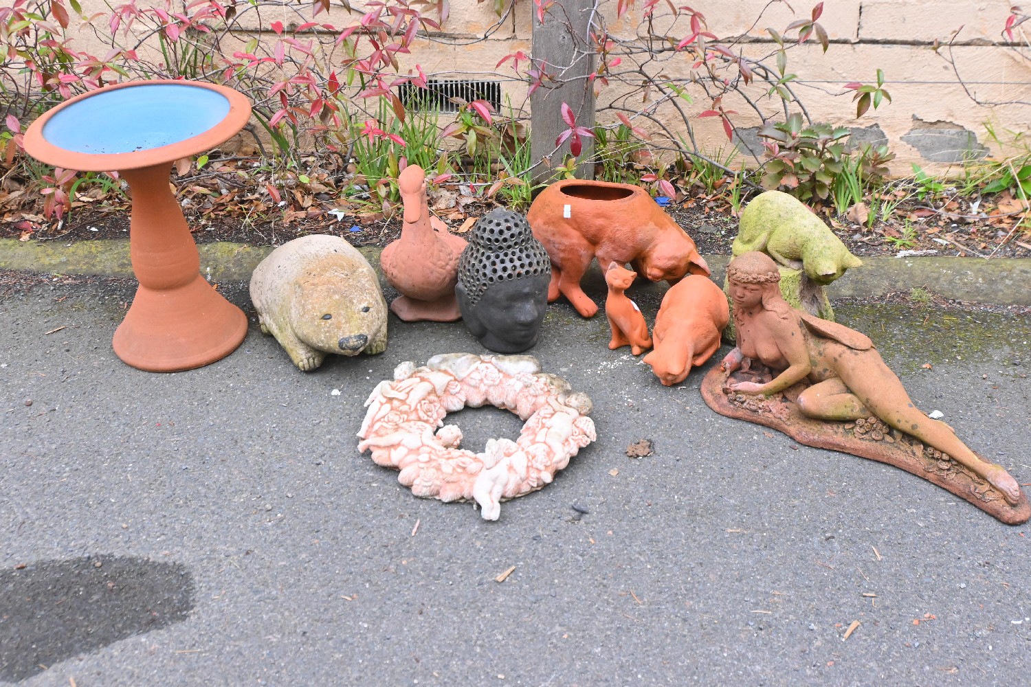 A COLLECTION OF CONCRETE & TERRACOTTA ANIMAL FIGURES & SIGURES - BREAK TO MAIDEN FIGURE (A/F) (PLEASE NOTE THIS HEAVY ITEM MUST BE REMOVED BY CARRIERS AT THE CUSTOMER'S EXPENSE. LEONARD JOEL STAFF CANNOT ASSIST CARRYING THIS ITEM) (X-LARGE ITEM)