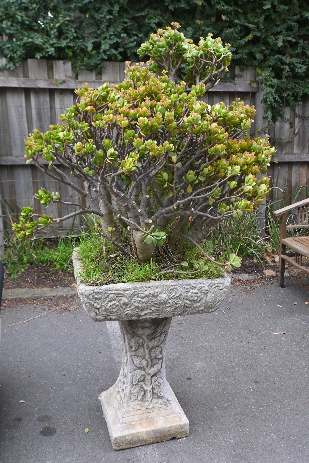 A JADE PLANT ON CONCRETE PEDESTAL (A/F) (180H X 62W X 62D CM) (PLEASE NOTE THIS HEAVY ITEM MUST BE REMOVED BY CARRIERS AT THE CUSTOMER'S EXPENSE. LEONARD JOEL STAFF CANNOT ASSIST CARRYING THIS ITEM) (X-LARGE ITEM)