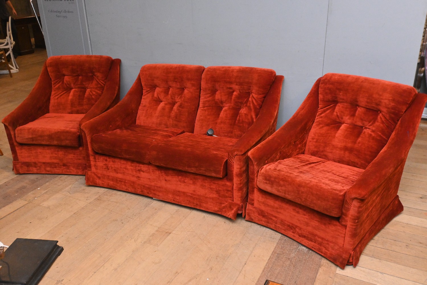 A PARKER THREE PIECE LOUNGE SETTING COMPRISING TWO SEATER SOFA AND TWO ARMCHAIRS (A/F) (81H X 136W X 98D CM) (PLEASE NOTE THIS HEAVY ITEM MUST BE REMOVED BY CARRIERS AT THE CUSTOMER'S EXPENSE. LEONARD JOEL STAFF CANNOT ASSIST CARRYING THIS ITEM) (X-LARGE ITEM)