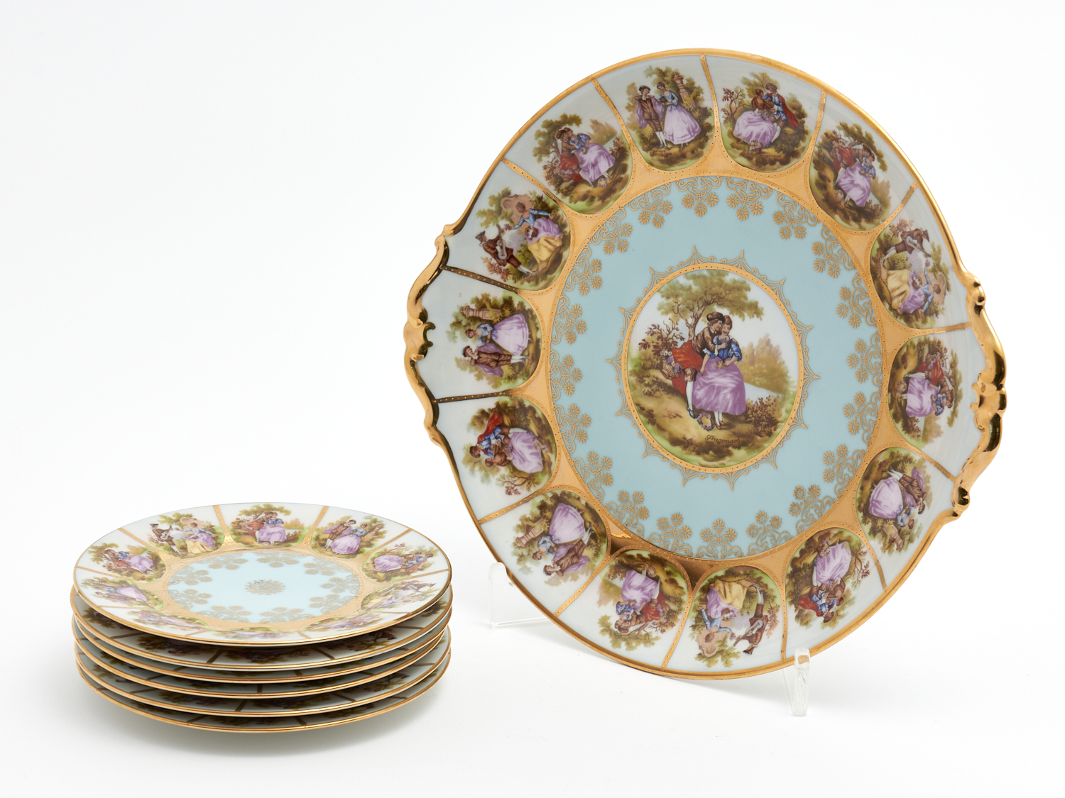 SIX GERMAN PORCELIAN CAKE PLATES TOGETHER WITH A SERVING PLATE DIA.28CM (LARGEST), LEONARD JOEL DELIVERY SIZE: MEDIUM