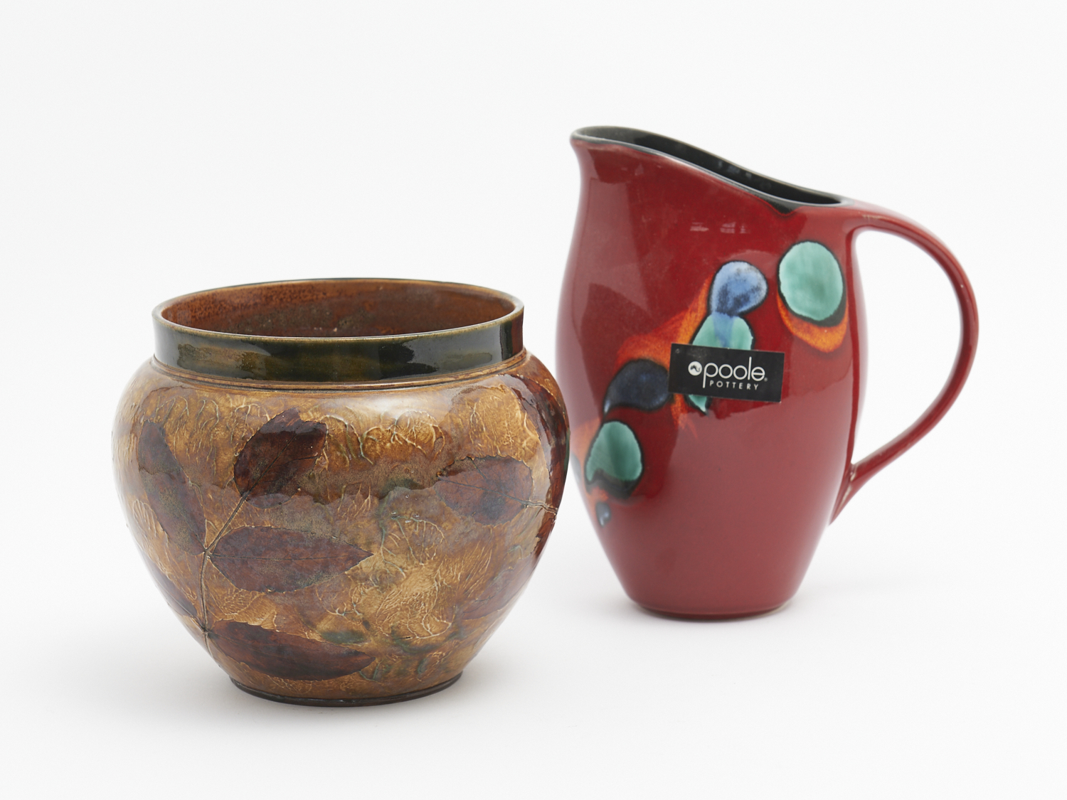 A ROYAL DOULTON JARDENIER TOGETHER WITH A POOLE POTTERY JUG H.22CM (TALLEST), LEONARD JOEL DELIVERY SIZE: MEDIUM