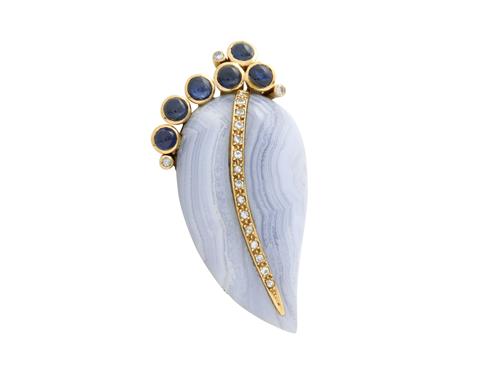 Comprising a drop shaped chalcedony cut en cabochon, centring a row of brilliant-cut diamonds and set to the top with a cluster of bezel-set circular cabochon sapphires and further brilliant-cut diamonds, the sapphires together weighing approximately 2.00 carats, the diamonds together weighing approximately 0.18 carats, measuring approximately 59mm x 30mm.