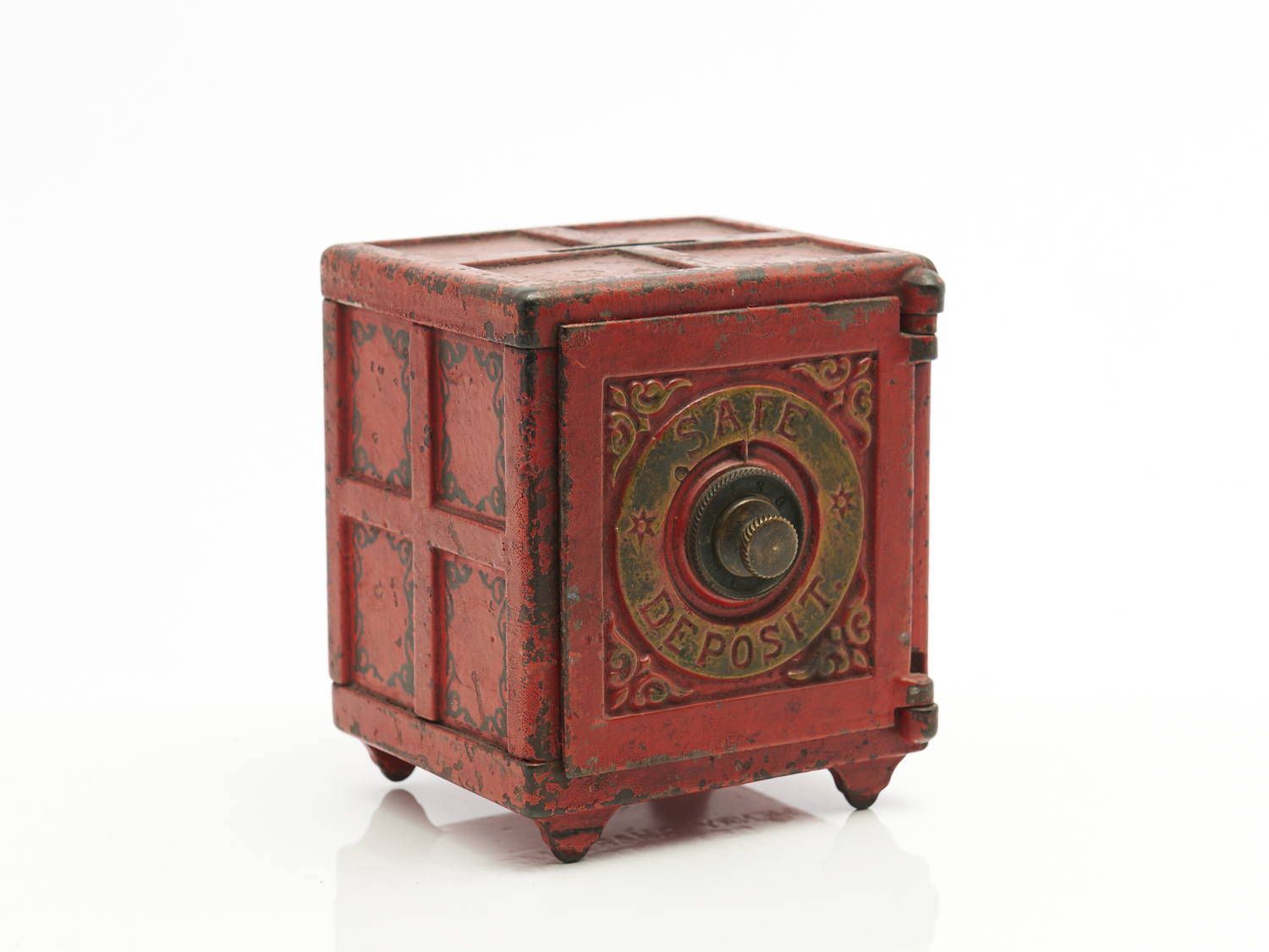 A SMALL VINTAGE RED ENAMELLED SAFE DEPOSIT BOX H.13CM, LEONARD JOEL LOCAL DELIVERY: SMALL